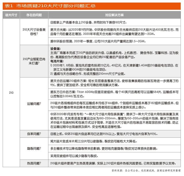 市场接受度且先不谈,对于光伏组件厂家来说,这两条路径选择的最大冲突集中于投入成本和风险上。如果选择第一条路径,相对来说,厂家需要耗费产线升级及相关人力投入的成本,但第二条路径却需要新建产线乃至厂房,其中购买新设备就是一笔大投入。两相比较,后者投入的成本更高、冒的风险更大。这也是在初期天合光能在行业内倡导生产和使用210硅片却得不到上下产业链支持的主要原因。如今,经过两年多的努力,天合光能将210硅片的盟友发展到39家,包括上游供应商、下游应用客户乃至同行。目前,182硅片和210硅片两条路线已经成为未来光伏组件厂家拓展大尺寸市场的选择。但相比于182硅片,210硅片的“大跃进”也让其充满质疑,比如在设备兼容性、产业链配套、运输、良率、热斑等等方面。根据浙商证券整理,如表1所示,天合光能、中环股份、晶盛机电、上机数控、爱旭股份、通威集团、东方日升等上下游已经就210大尺寸存在的问题进行研发、解决。
